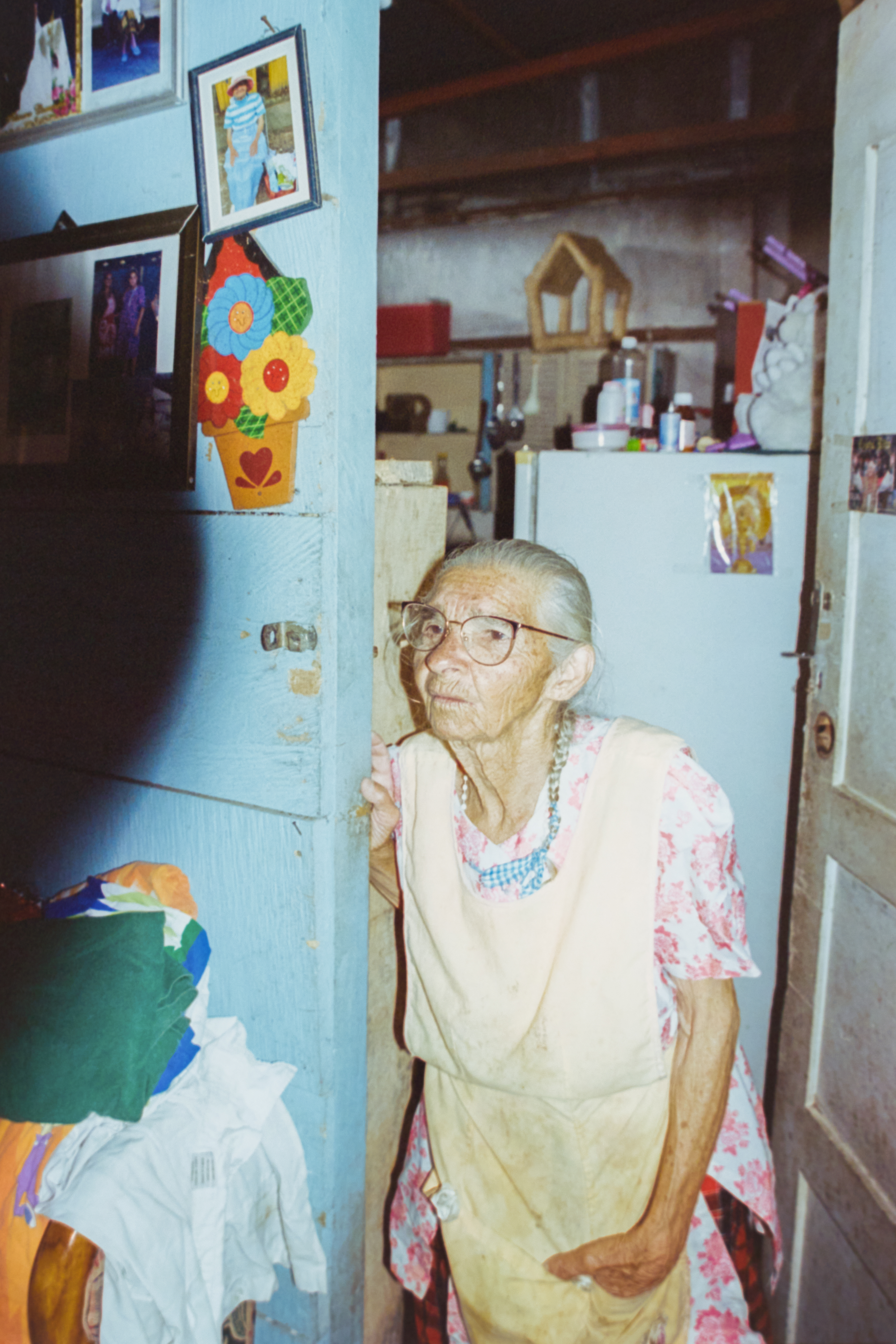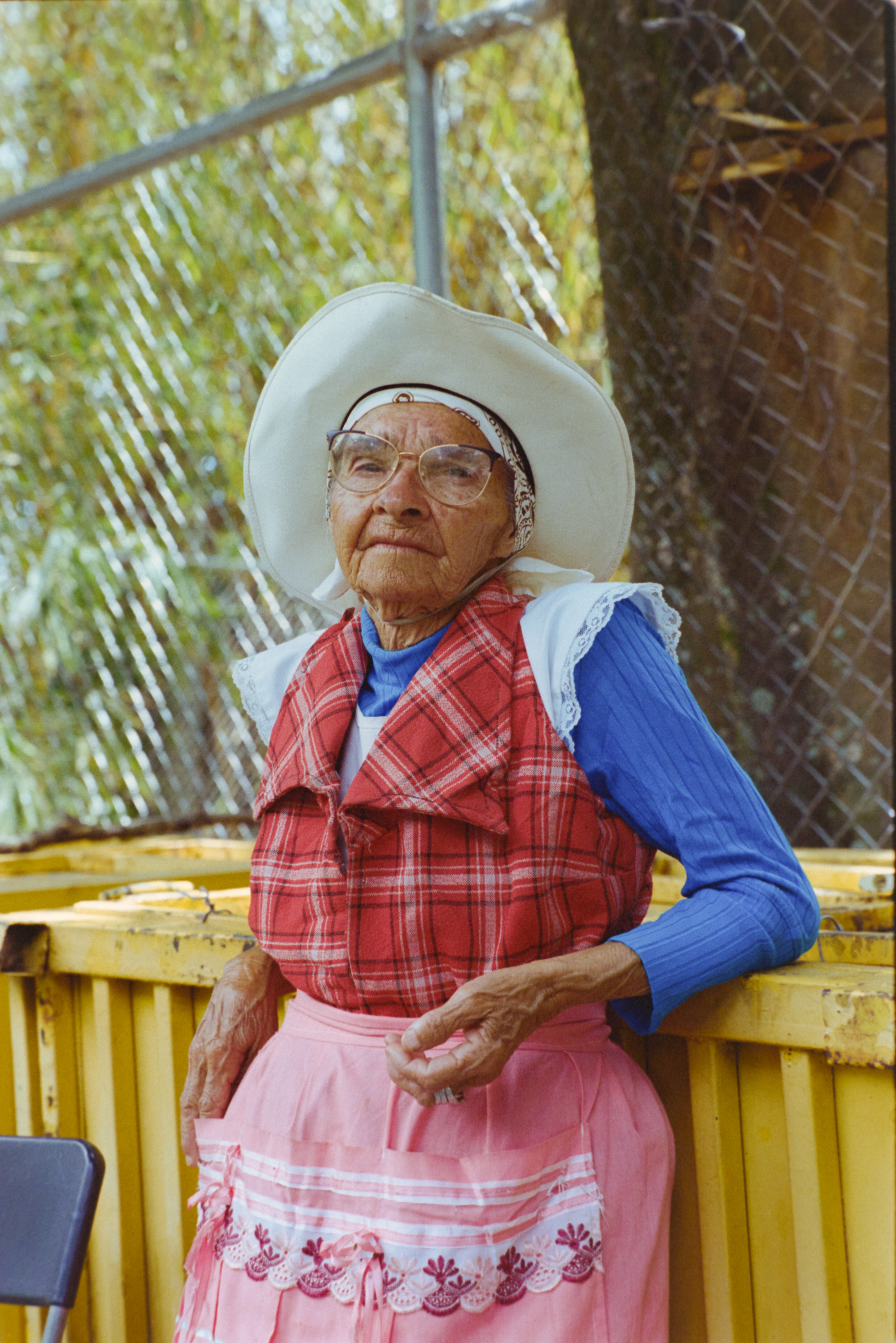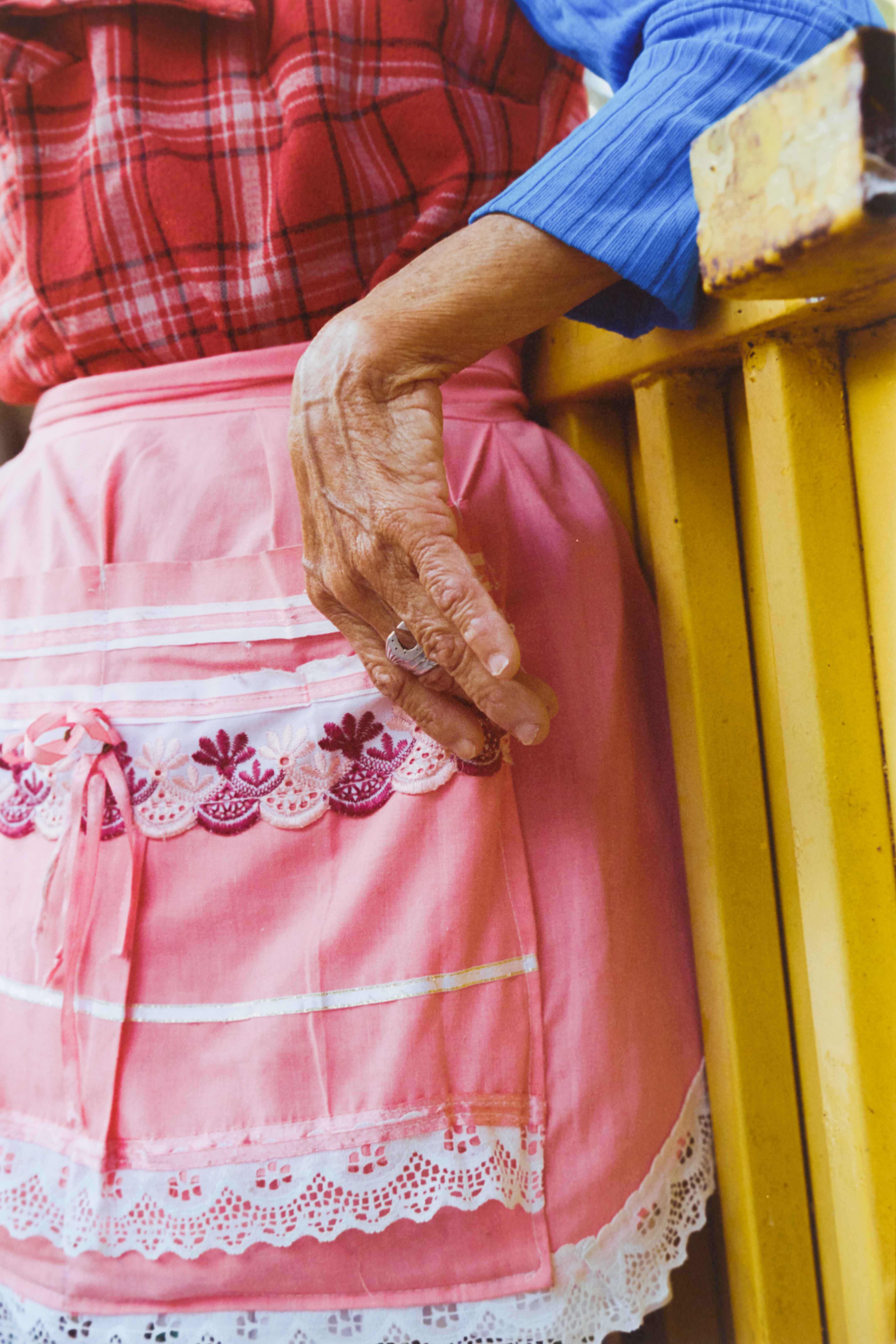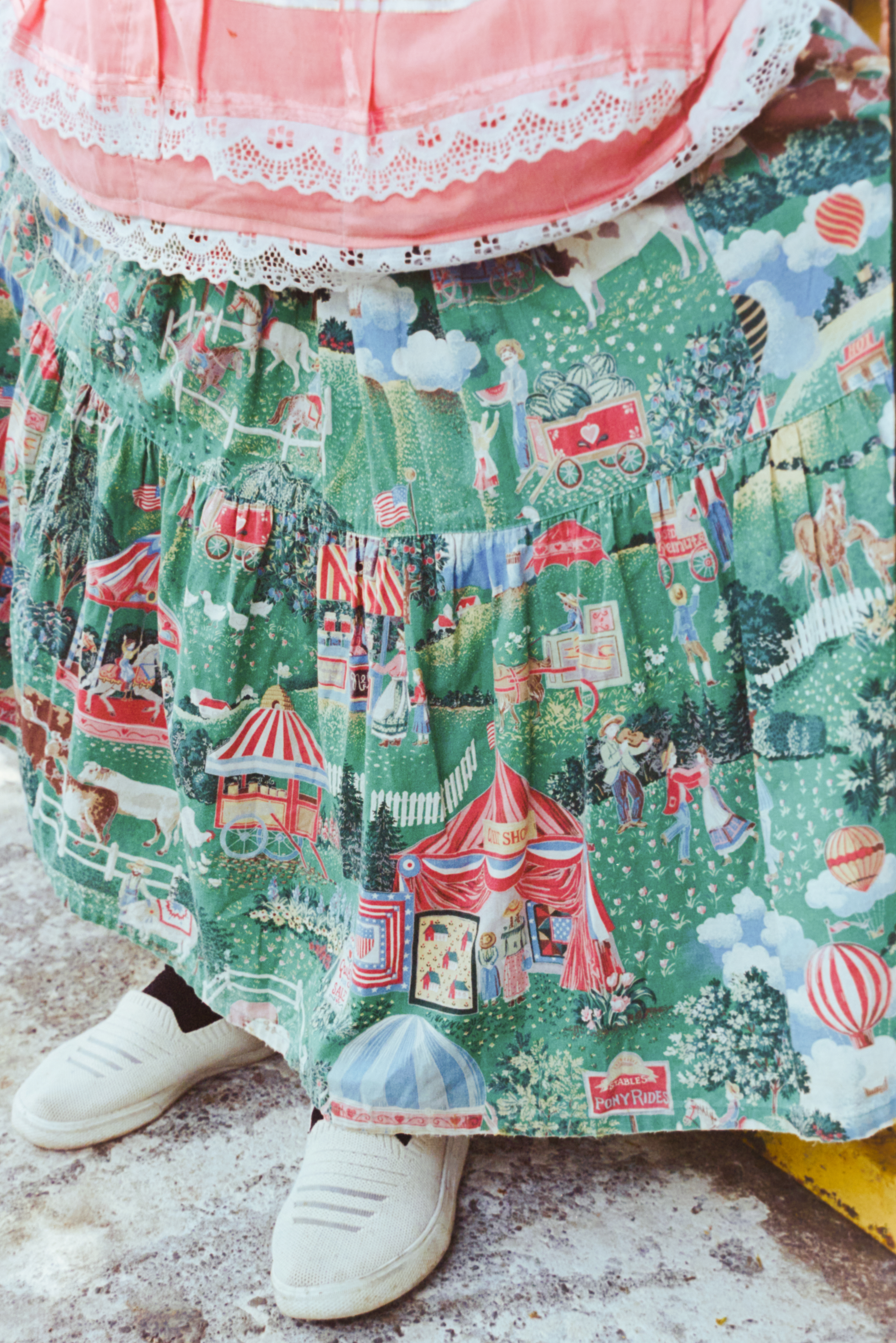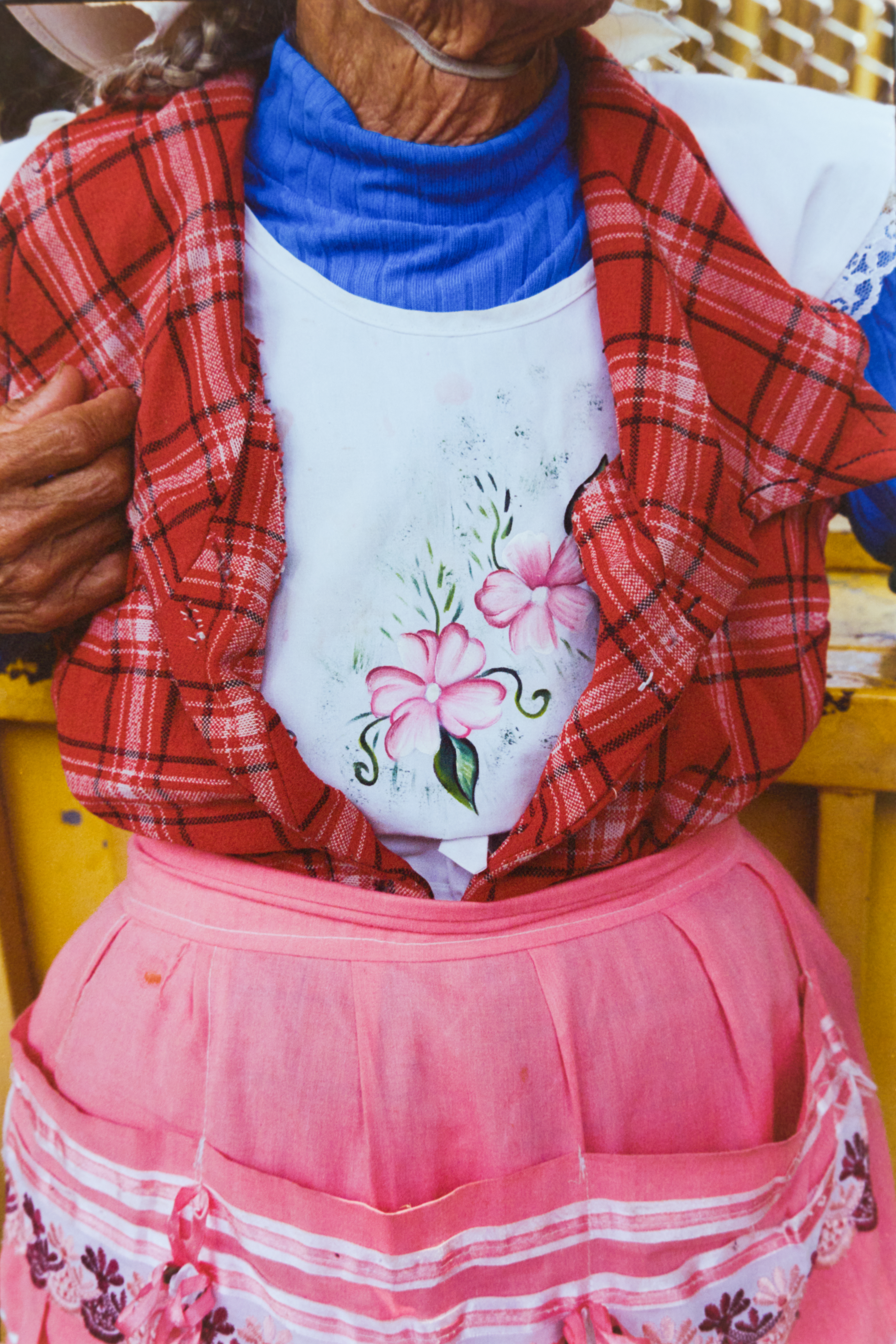 Su forma de vestir es excesiva: capas de telas cosidas a mano, estampados, colores, flores, medias, pañuelos, sombreros, baberos. Todo al mismo tiempo. Todo entrelazado. Una trenza con una cinta blanca. Unas manos suaves dentro de un delantal rosado.