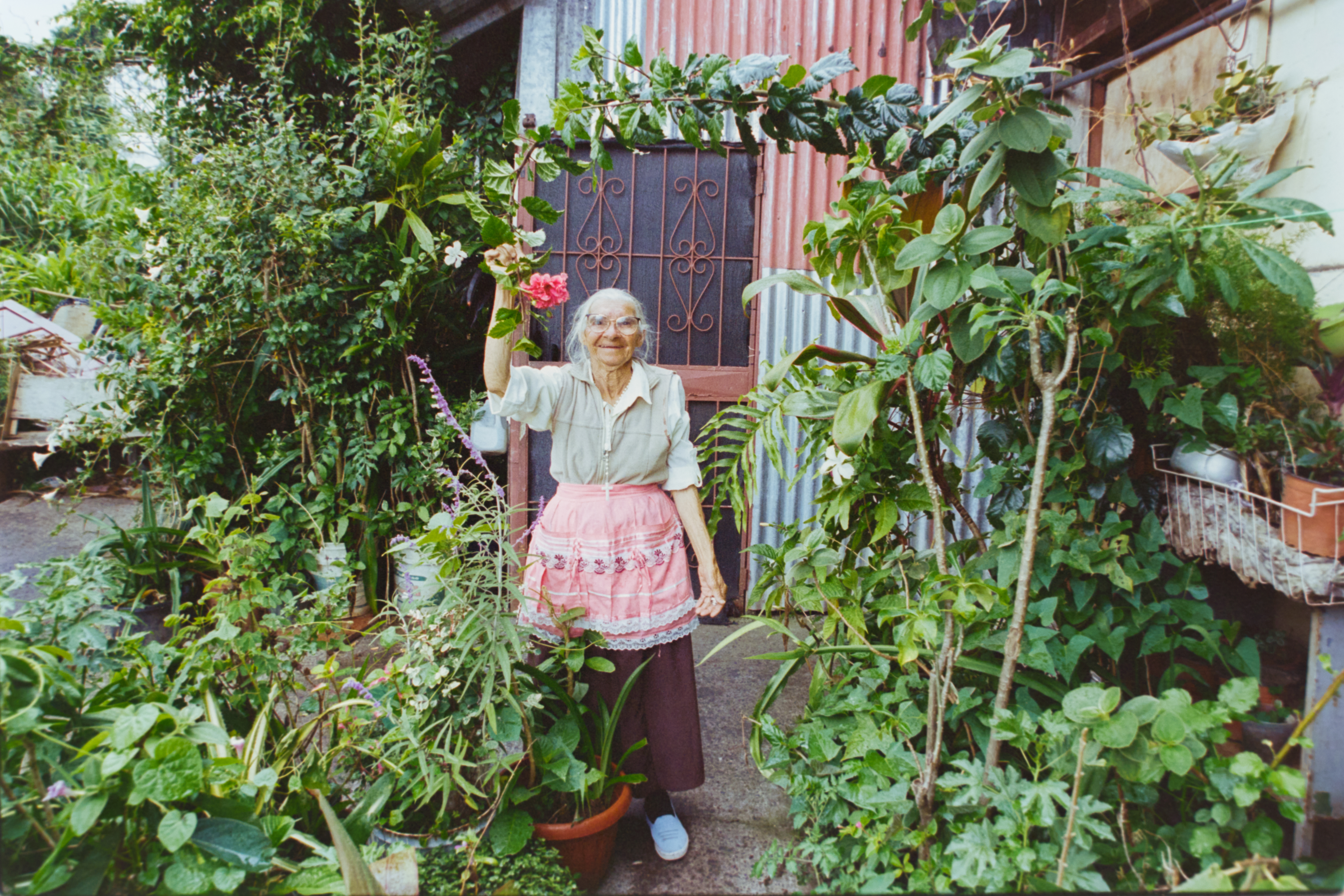 Doña Eida, con 84 años, se para todos los días en el puente en la entrada de Escazú centro, de 6:00 a.m. hasta que caiga la primera gota de lluvia. Sostiene trapitos de cocina con estampas de vegetales en una mano y, en la otra, una bolsa con mangos. Pone sus plantas en el piso y le pide a Dios que haya buena venta.