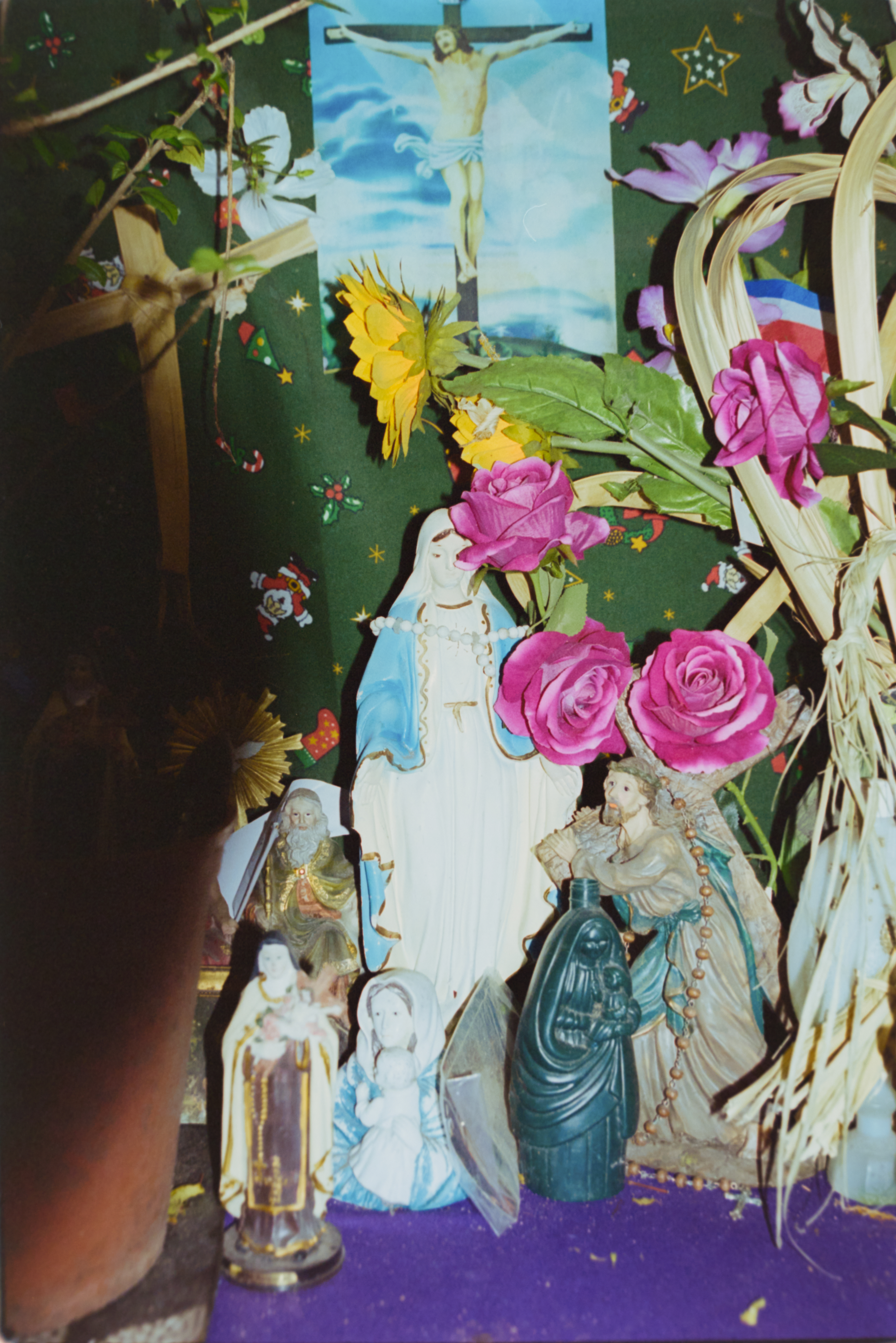 Entre juguetes de niños y ropa colgada reposa un altar de la virgen al fondo de su casa. Imágenes religiosas, flores plásticas, fotos de Jesús, esculturas de apóstoles, candelas y un mantel verde con melcochas y Santas.