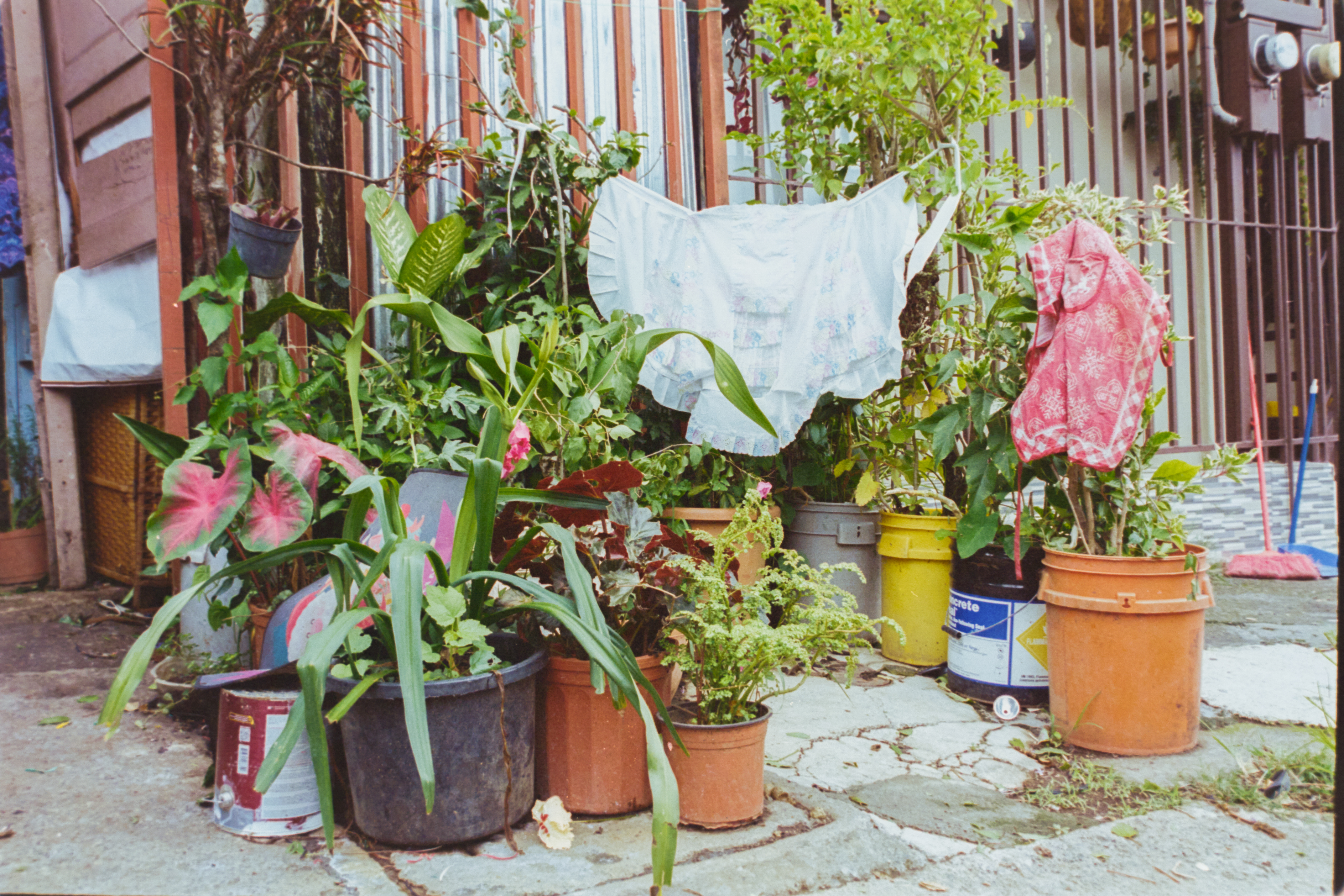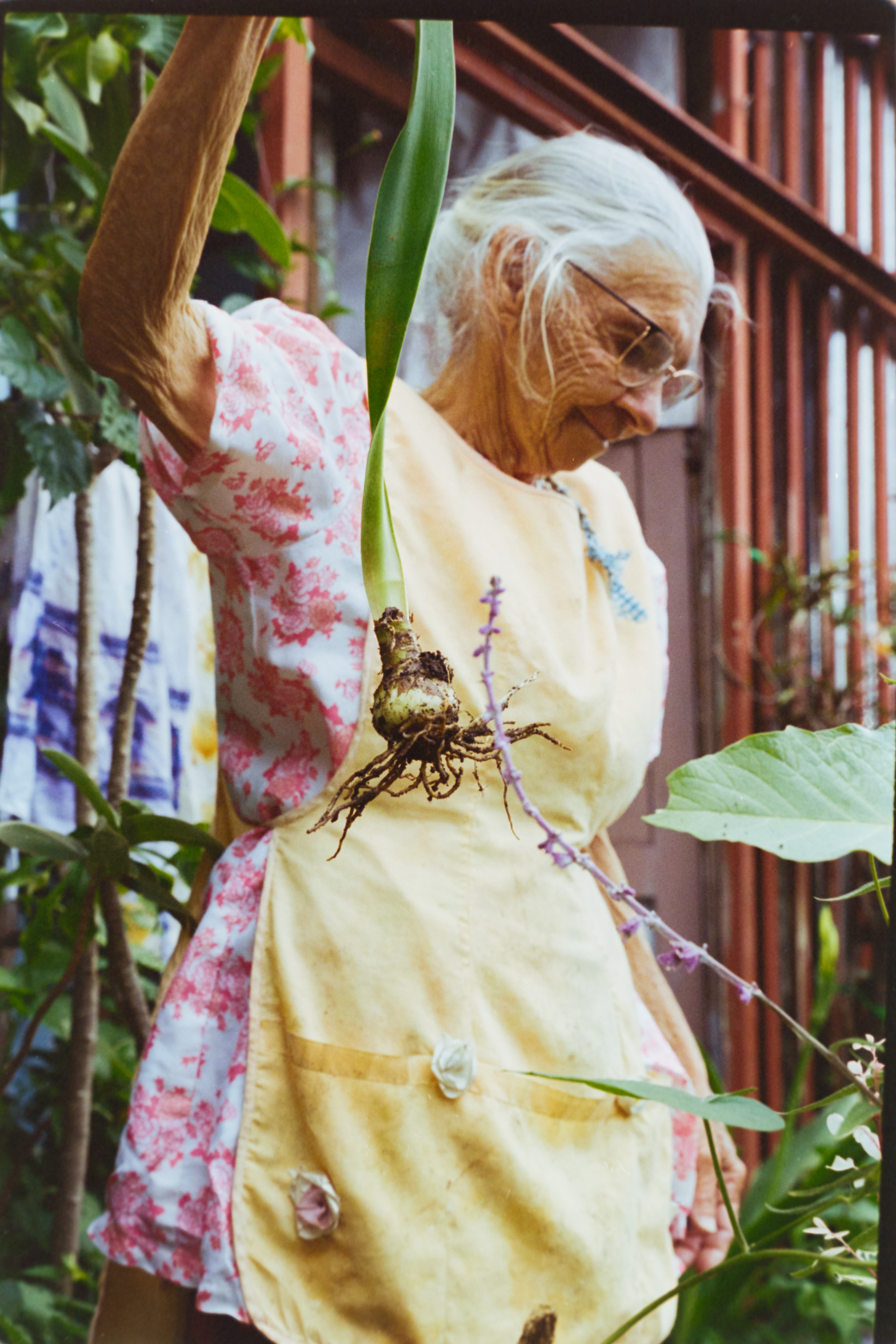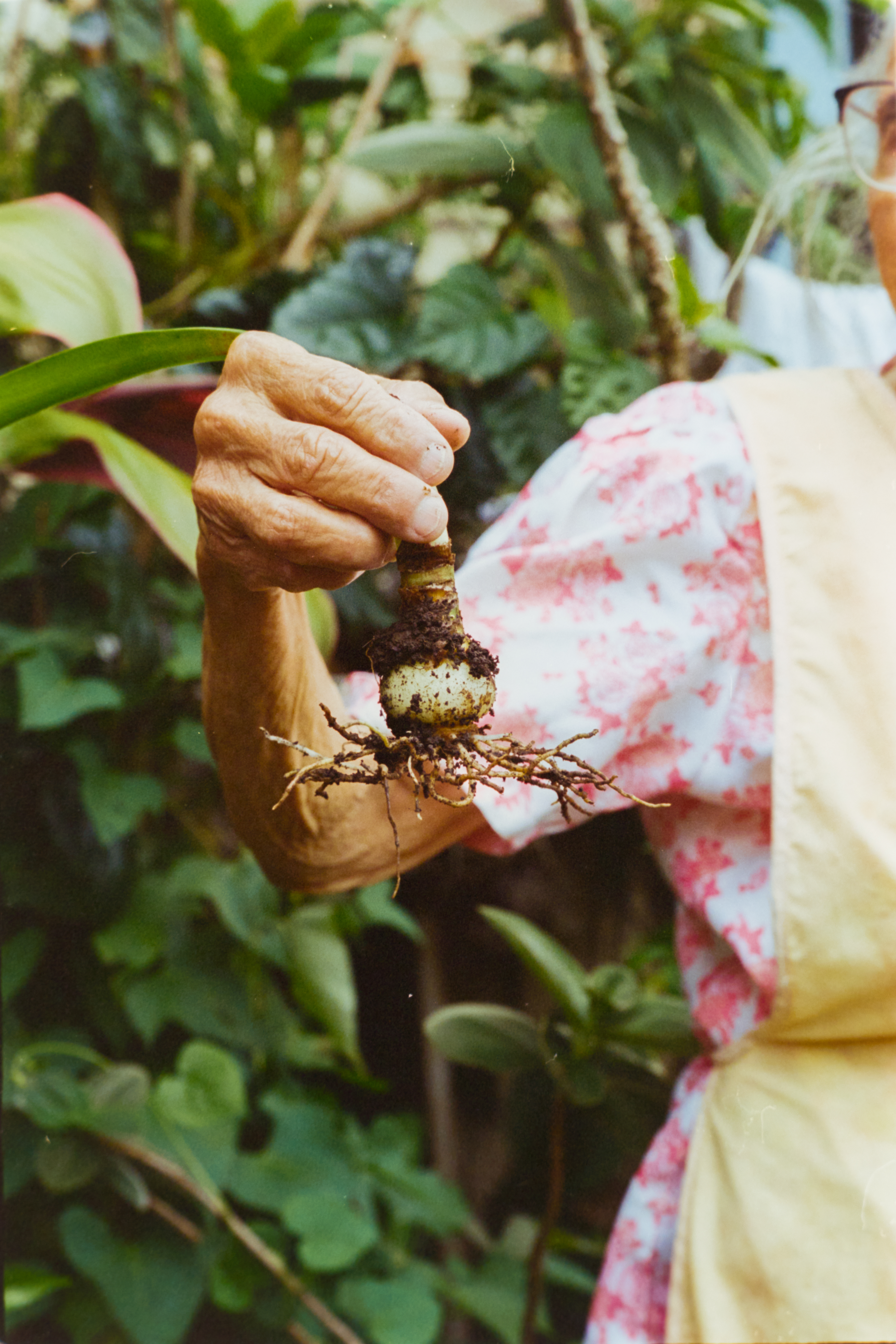 La entrada de su casa está enmarañada entre plantas. Lo que a simple vista parece monte rápidamente se convierte en el más exquisito vivero. Empieza a sacar cebolla, camote, lírios y matas que solo tiene ella, porque a ella "le pega todo".
